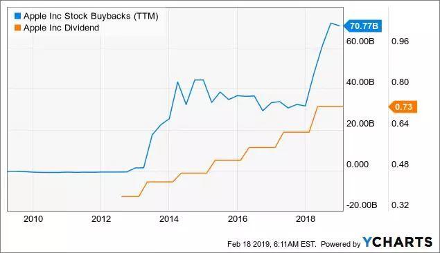 苹果通过股票回购和股息的组合向其所有者返还现金,尽管重点明确在于股票回购: