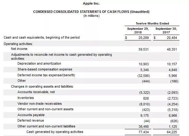 在截至2018年9月29日的上一财年(2018财年),苹果已经产生了770亿美元的经营现金流。苹果 2018财年的现金流量比公司上一财年的现金流高20%。