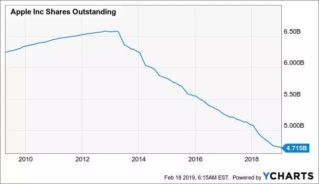 当我们看看这些股票回购对苹果股票数量的影响时,我们会看到以下情况: