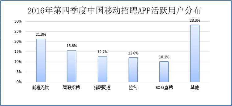 据艾媒咨询发布的《2016-2017中国移动招聘市场研究报告》显示,在2016年第四季度移动招聘APP的活跃用户数方面,前程无忧和智联招聘仍占据前两名,市场份额分别为21.3%和15.6%,主导互联网招聘市场,但新兴平台猎聘同道、Boss直聘和拉勾网已经分别占到市场份额的12.7%、12.0%和10.1%,智联招聘比行业排名第三的猎聘同道仅高出2.9%。可以看出,新生力量已对老牌招聘企业带来竞争威胁。