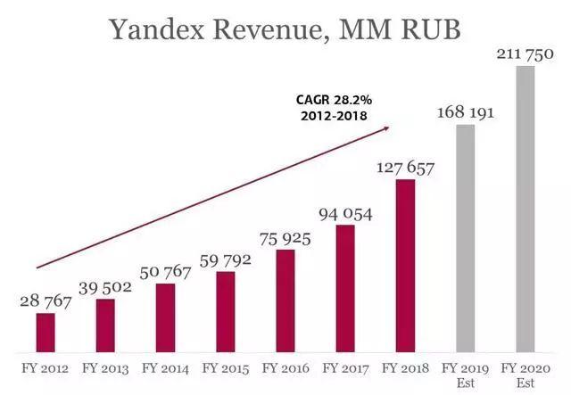 自2012年以来,Yandex 的收入年复合增长率为28.2% ,预计2019年增长32% ,2020年增长26% 。
