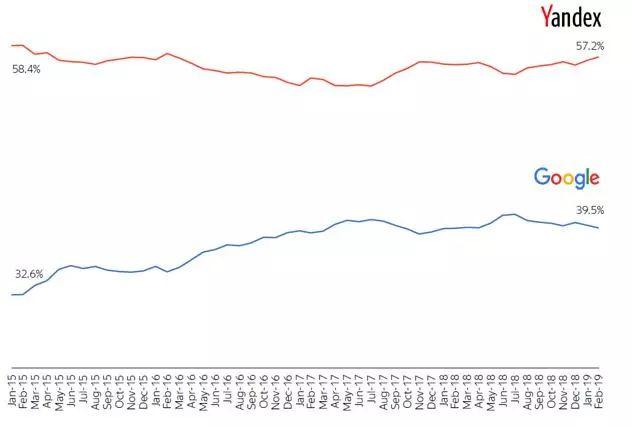 Yandex是俄罗斯除iOS外所有平台搜索市场的领导者。在2019年2月,Yandex的搜索份额为68.9%,Android为51.3%,iOS为40%。总体份额达到57.2%。