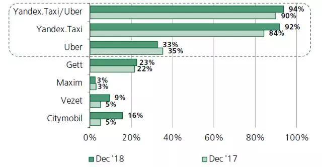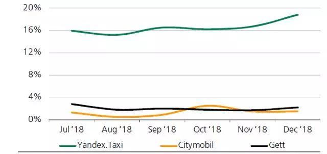 在2018年12月,Yandex.Taxi 的移动设备月销量增长为19% ,将其主要竞争对手远远甩在身后。